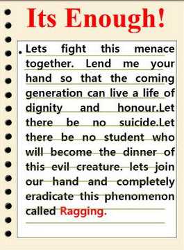 The juniors are usually too frightened to resist their organized group of tormentors. In recent times this practice has turned ugly. Every year number of cases of severe physical ragging as well as sexual abuses during the ragging. This has a great adverse psychological impact on the personality of the students and the scars of such incidents take a very long time to heal.